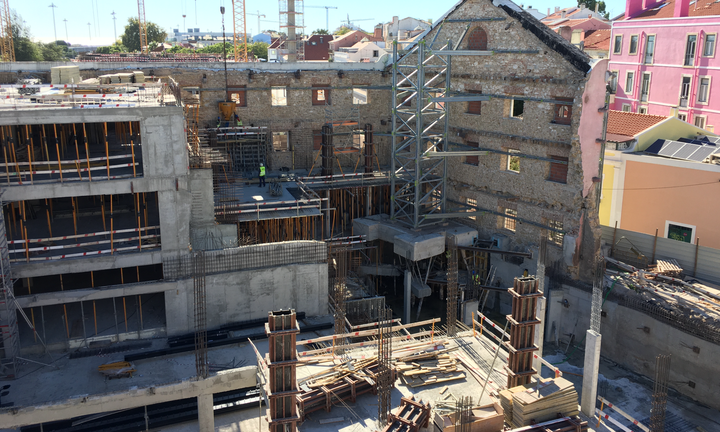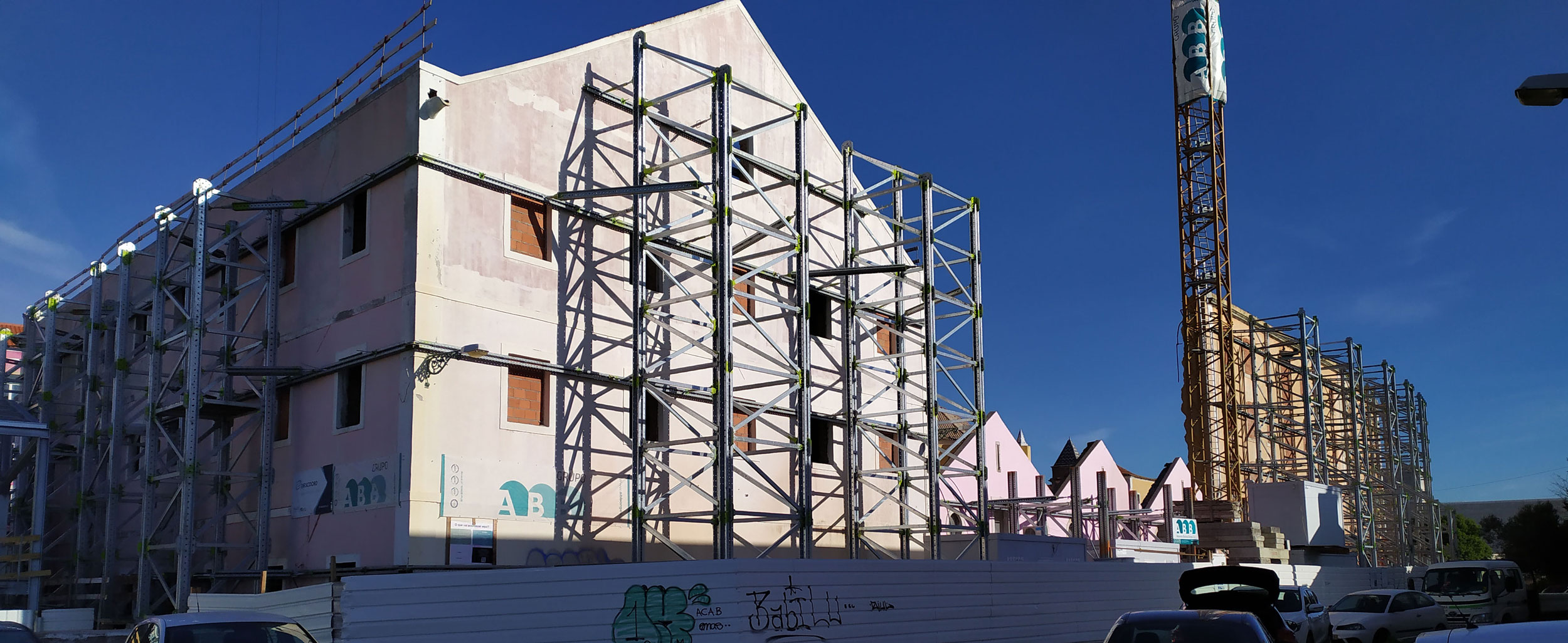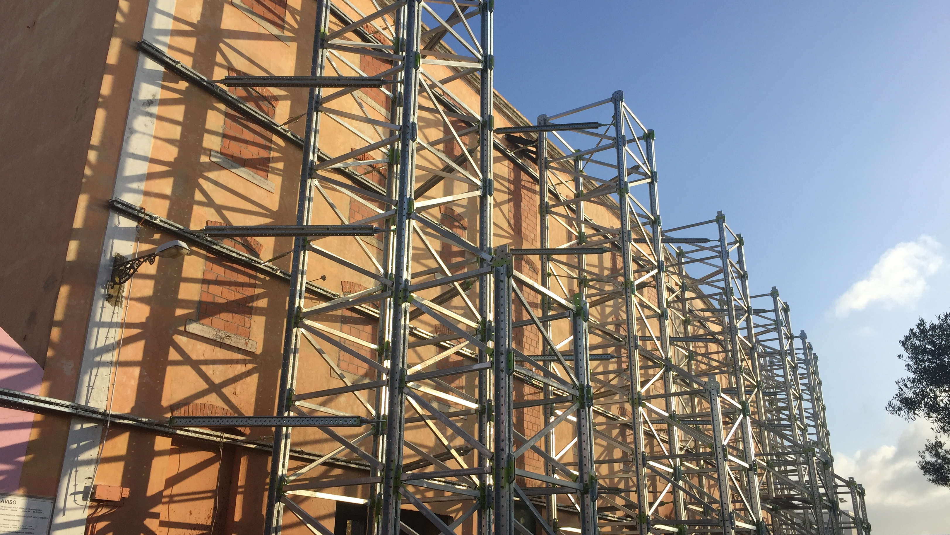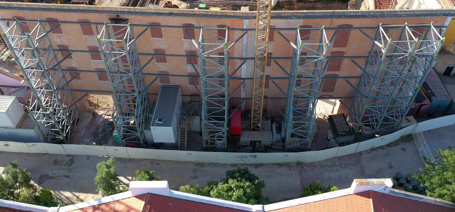Elaboração de projeto, montagem e desmontagem de contenção de fachada de 3 edifícios e um muro. Foram montadas num total de 13 torres de contenção com material HD e 5 torres de contenção com material LT. Foram utilizados 125.000kg de perfis metálicos e respetivos acessórios.